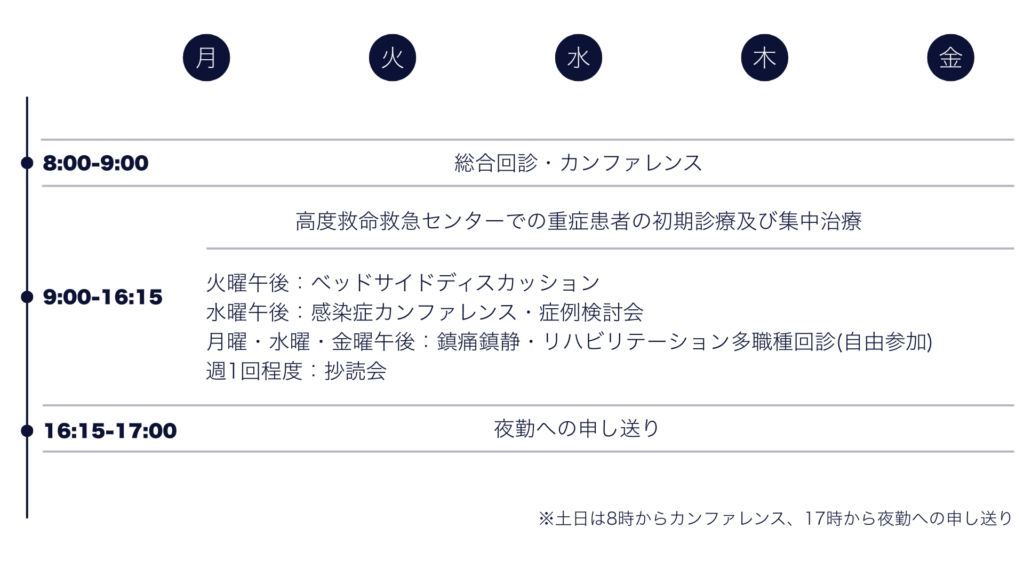 日勤はおおむね 8:15〜17:00(病棟業務)を基本とし、当直は月2〜3回程度です。夜間もICU管理や救急対応が中心になります。
