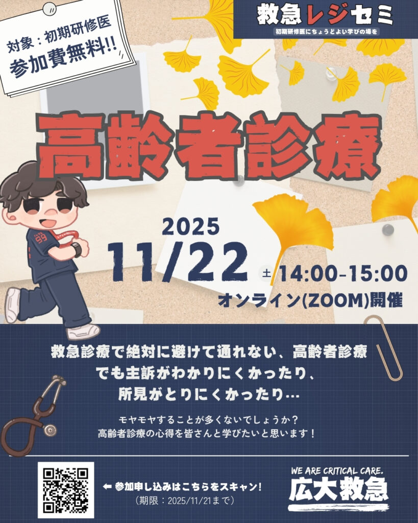 2025年11月22日(土)14:00~15:00(Zoom開催)に、救急レジセミ presents「高齢者診療」を開催します。